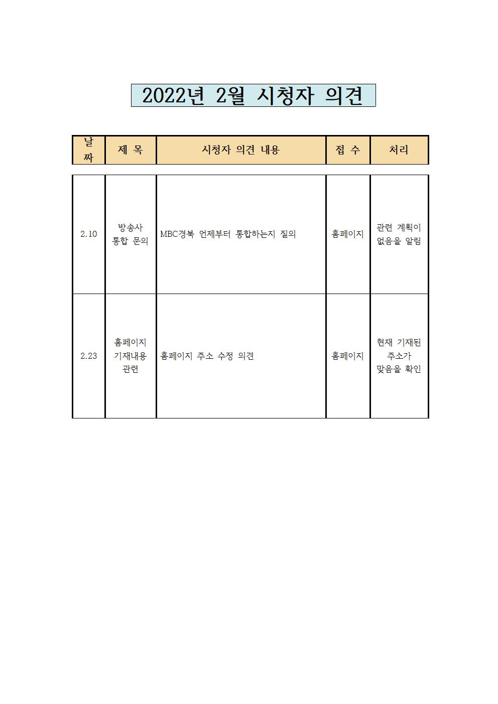 2022년 2월 시청자의견 접수 및 처리현황