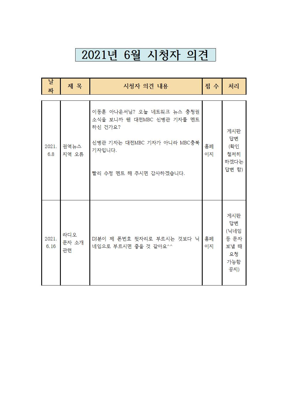 2021년 6월 시청자의견 접수 및 처리현황