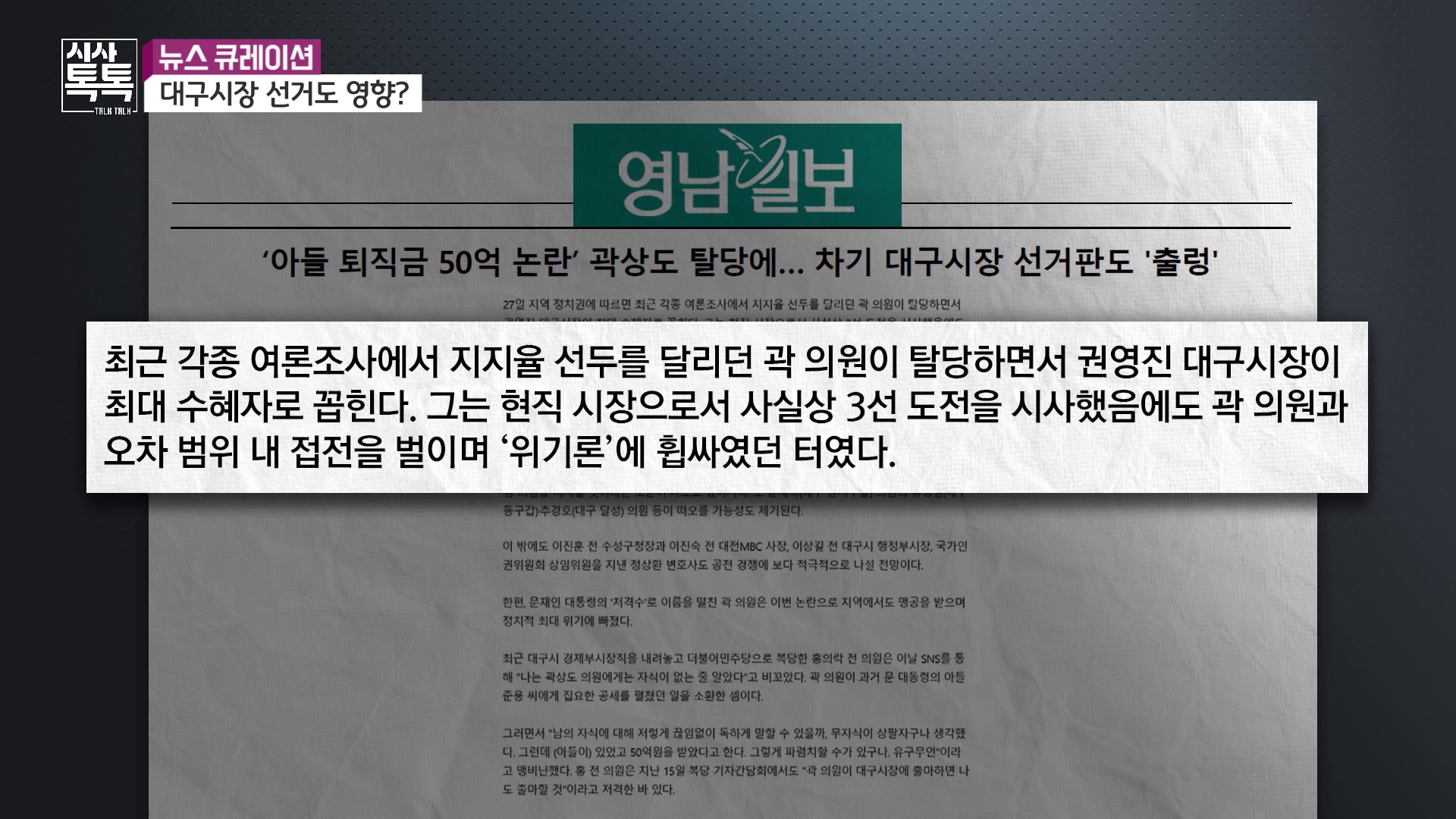 또 다른 언론은 권 시장이 가장 큰 반사이익을 얻는 것처럼 보이지만 강력한 후보였던 곽상도 의원 자리를, 대구를 지역구로 둔 현역 의원과 지역 출신 인사들까지 여러 인사가 목표하면서 여러 인사들이 물망에 오를 것이라는 전망을 내놨습니다.