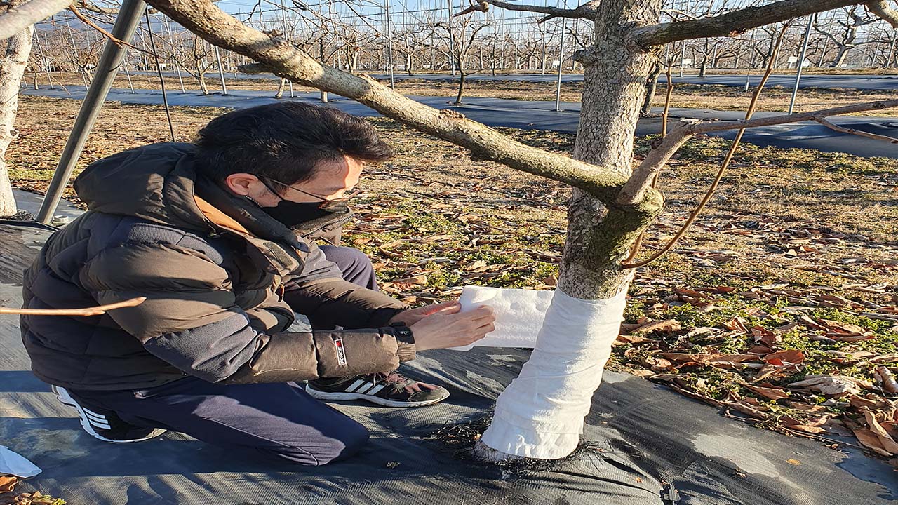 동해를 줄이기 위해서는 지면 위 나무 원줄기 부분을 볏짚이나 신문지, 부직포, 보온 패드 등으로 감싸줘야 합니다.