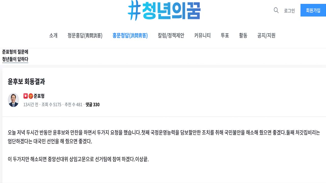 홍의원은 온라인 커뮤니티 '청년의꿈'에서 '이재명도 안 되지만 윤석열의 청와대 입성을 반대'한다는 지지자의 의견에 대해서 "이재명보다는 윤석열이 낫다"고 말했습니다.