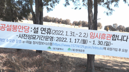 대구시립공원묘지에 있는 공설봉안당이 코로나 19 확산을 막기 위해 설 연휴 기간인 1월 31일부터 2월 2일까지 3일간 휴관합니다.