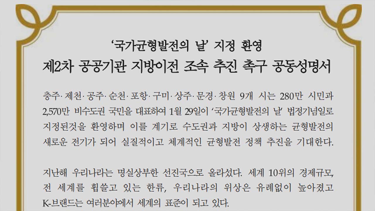 오는 29일 제1회 국가균형발전의 날을 앞두고 발표된 공동성명서에서 9개 지자체장들은 "9개 시는 280만 시민과 2천570만 비수도권 국민을 대표해 수도권과 지방이 상생하는 균형발전의 새로운 전기가 되기를 기대한다"고 밝혔습니다.