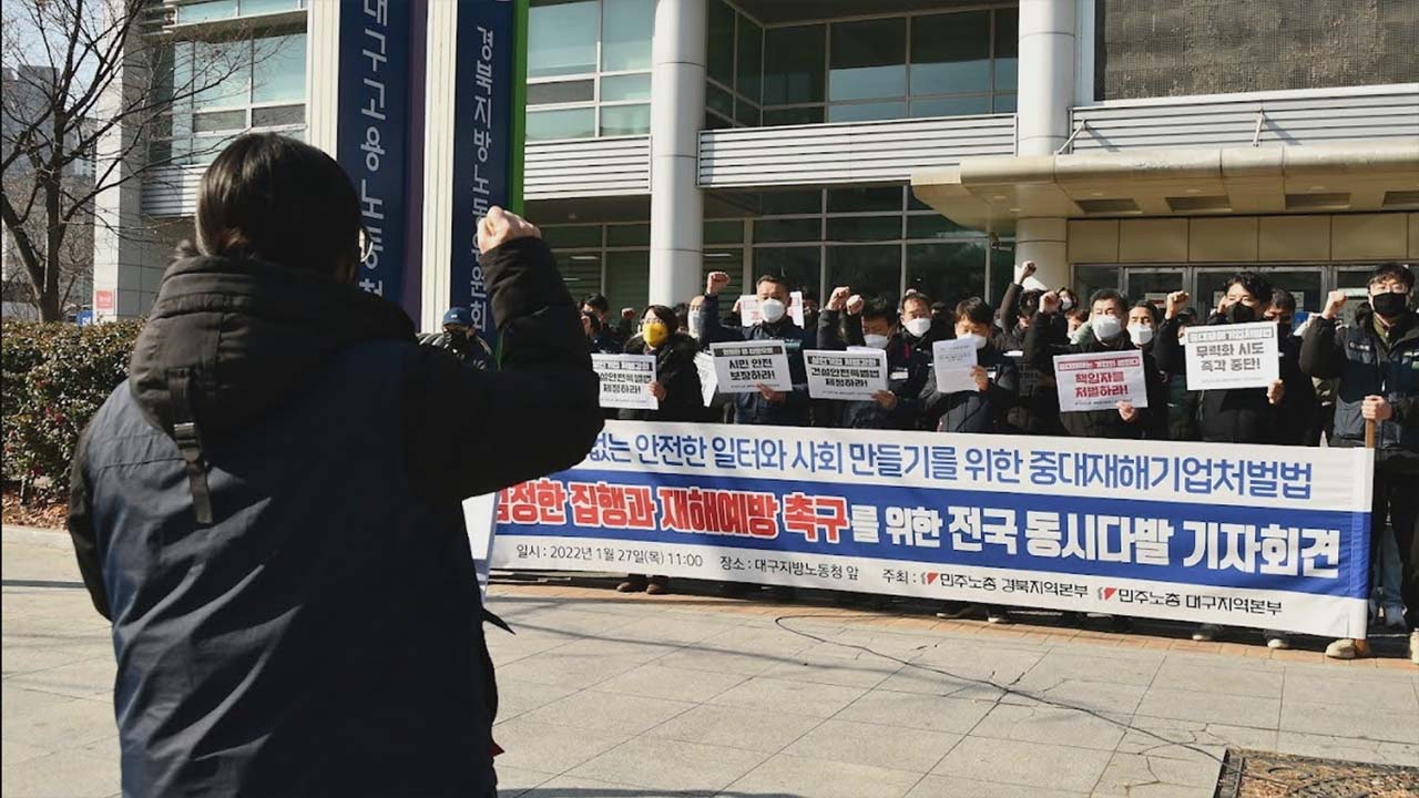 민주노총 대구지역본부와 정의당 대구시당은 대구지방노동청 앞에서 기자회견을 열고 "법 시행 이후에도 다시 꼬리 자르기 처벌, 솜방망이 처벌이 반복되어서는 안 된다"며 "중대재해처벌법이 현장과 시민의 삶에서 실질적인 힘으로 작동될 수 있도록 감시하고 투쟁하겠다"고 밝혔습니다.
