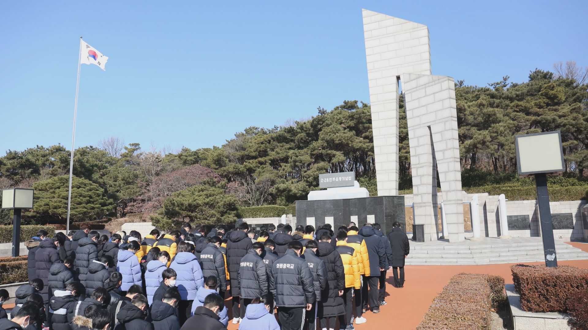 개막 하루 전인 20일 오전 남·여 대표선수 등 200여 명의 임원과 선수가 두류공원 2.28 민주운동 기념탑을 참배해 2.28 정신을 기렸습니다.