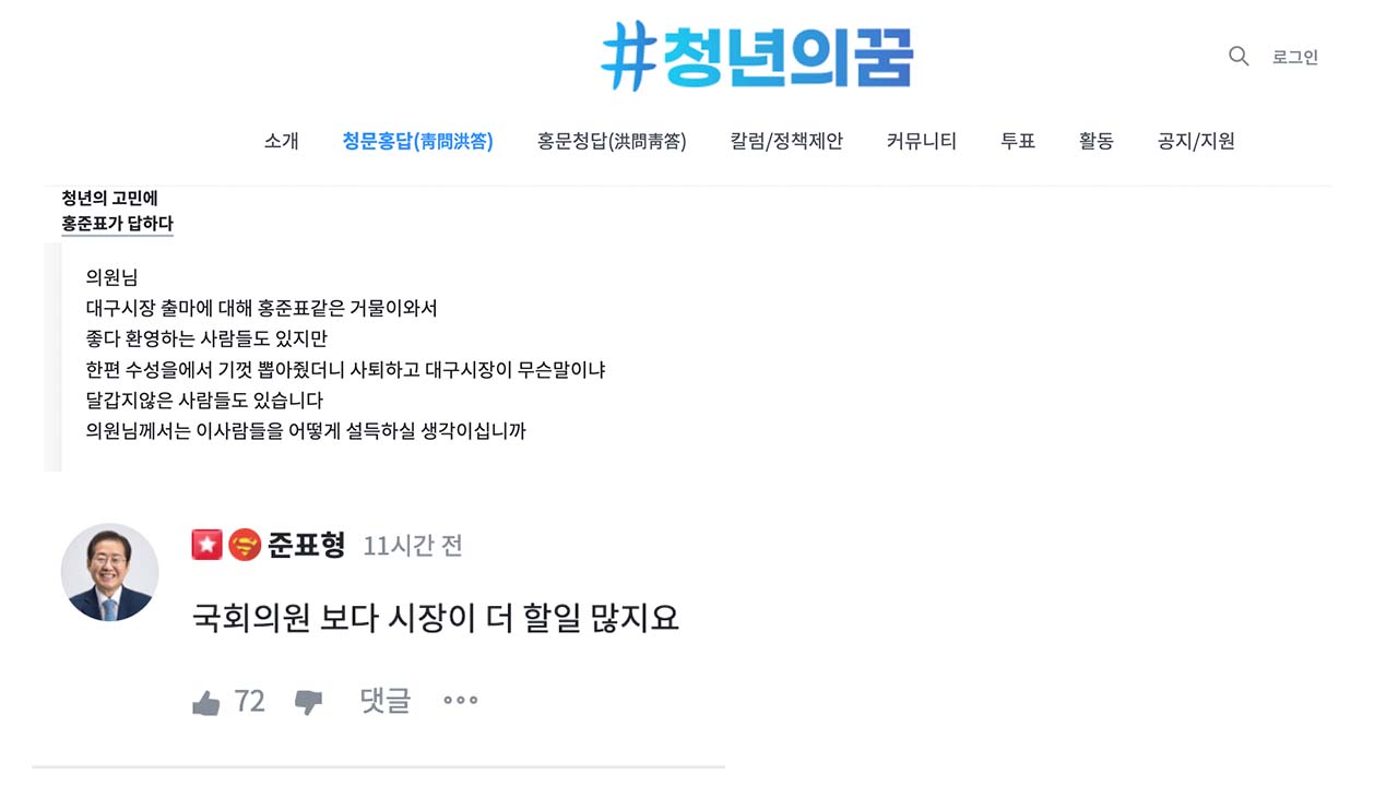 홍준표 의원은 온라인 소통채널인 '청년의꿈'에 한 지지자가 "대구시장 출마에 대해 홍준표 같은 거물이 와서 좋다는 사람도 있지만 수성을에서 기껏 뽑아줬더니 대구시장 나간다고 달갑지 않은 사람들도 있다"라는 질문에 대해 국회의원보다 시장이 할 일이 더 많다고 답했습니다.