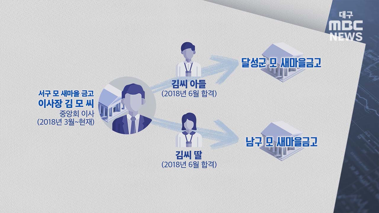 대구 달성군의 한 새마을금고에서 일하는 A 씨. 남구의 한 새마을금고에서 일하는 B 씨. 이들은 2018년 상반기에 함께 입사했습니다. 입사 동기인 둘은 남매입니다. 아버지는 대구 서구의 한 새마을금고 이사장 김 모 씨입니다. (신협의 김 모 이사장과는 다른 사람입니다.) 자녀들이 원서를 내기 직전인 2018년 3월 이사장 김 씨는 새마을금고중앙회 이사로 취임했습니다. 중앙회 이사는 각 시도마다 한 명씩인데 김 씨는 대구 102개 새마을금고를 지도, 감독하는 권한을 갖고 있습니다. 새마을금고중앙회 대구지역본부에 가면 지역 이사인 김 씨를 위한 방이 중앙회 지역본부장 방 옆에 있습니다.
