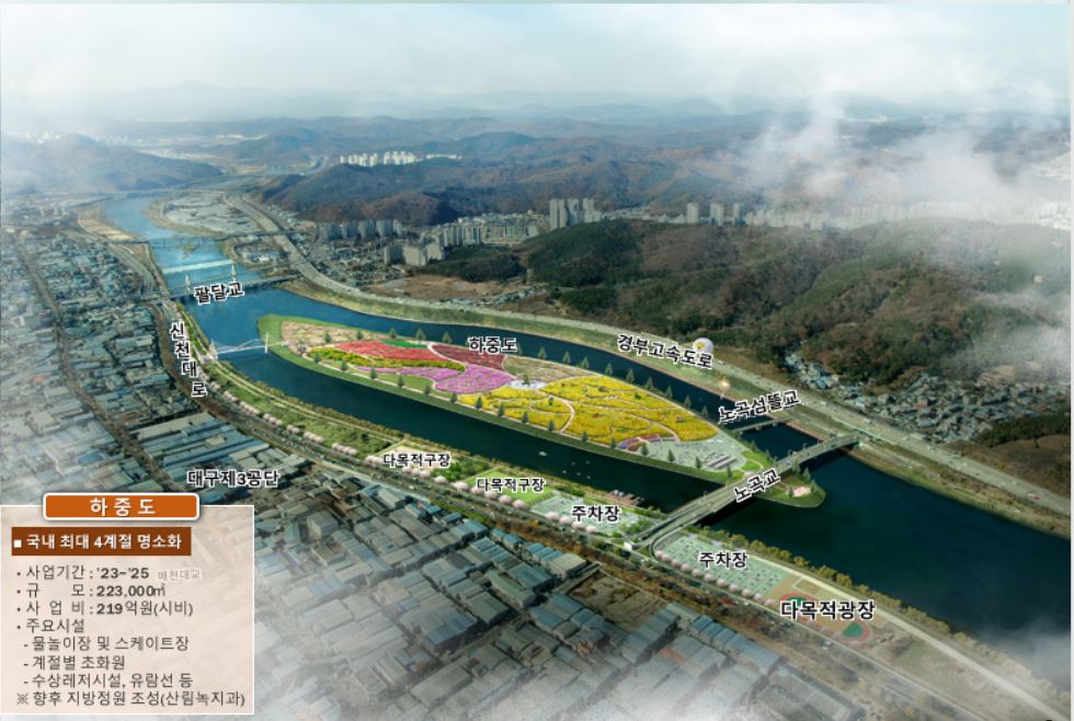 대구시는 금호강 하중도에 접근할 수 있도록 신천대로에서 주차장으로 연결하는 진출입로를 새로 만들고 둔치와 하중도를 연결하는 보도교, 팔달교 남쪽 경사로 1개를 만들었습니다.