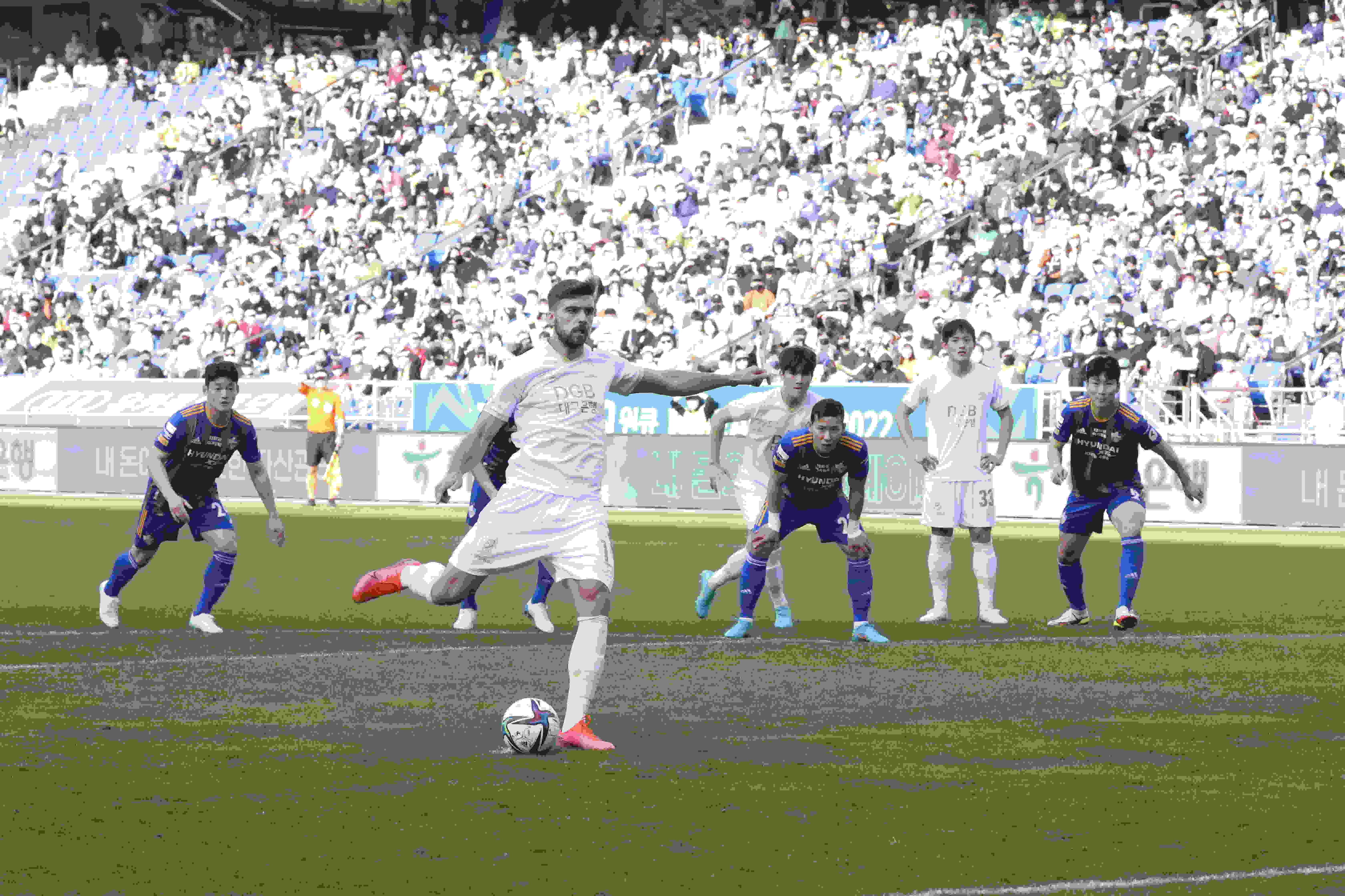 4월 9일 오후 울산문수축구경기장에서 펼쳐진 하나원큐 K리그1 2022 9라운드 울산현대와의 맞대결에서 대구FC는 전반 7분 이근호가 얻은 페널티킥을 새로운 외국인 선수 제카가 선취골로 연결시키며 1대 0으로 앞선 가운데 전반을 마쳤습니다.