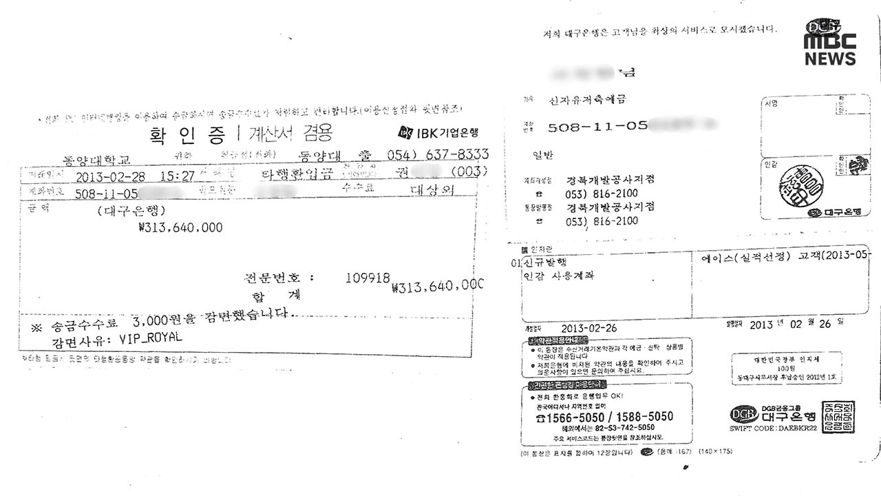 B 씨는 돈을 돌려받는 과정에서 기존 자신의 계좌가 아닌 새 계좌를 만들어 동양대로부터 돈을 지급받은 것도 확인됐습니다. 아래에 제시한 것은 B 씨의 통장 사본과 동양대학교가 B 씨에게 3억 1,364만 원을 보낸 은행의 확인서입니다. B 씨는 2013년 2월 26일 대구은행 경북개발공사 지점에서 계좌를 새로 만든 뒤 이틀 뒤인 2월 28일 동양대학교로부터 3억 1,364만 원을 지급받았습니다. B 씨는 왜 기존의 자신의 계좌로 돈을 받지 않고 굳이 계좌를 새로 만들었을까요?