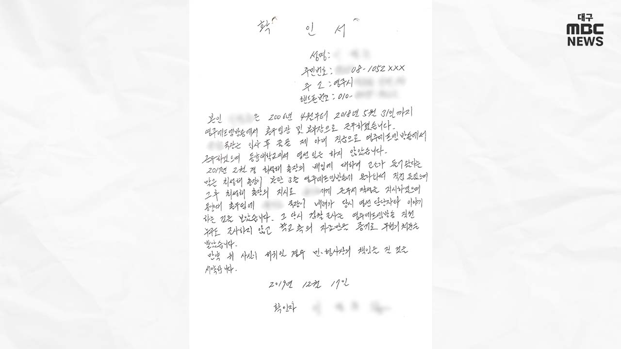 기자는 당시 영주FM방송의 본부장 C 씨를 비롯해 직원 4명의 관련 내용에 대한 확인서를 확보했습니다. C 씨는 확인서에서 “2017년 2월 경 동양대 본관 3층 영주 FM방송국에서 최성해 총장이 배임으로 고소가 들어왔다고 자신에게 말했고, 그 뒤 최 전 총장이 총무팀 직원에게 근무서 작성을 지시하였으며, 이후 A 씨가 동양대 총무팀에 내려가 당시 영선 담당자와 이야기하는 것을 보았습니다.”라고 적었습니다.