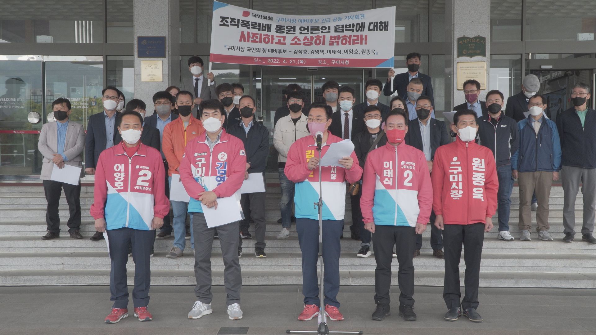 구미시장 공천 신청자 가운데 5명은 공동 기자회견을 열고 "모 후보가 사람을 동원해 언론인을 협박한 의혹이 있다"라면서 후보직 사퇴를 촉구했고, 해당 후보는 "사실무근, 명예훼손"이라며 맞대응하고 있습니다.