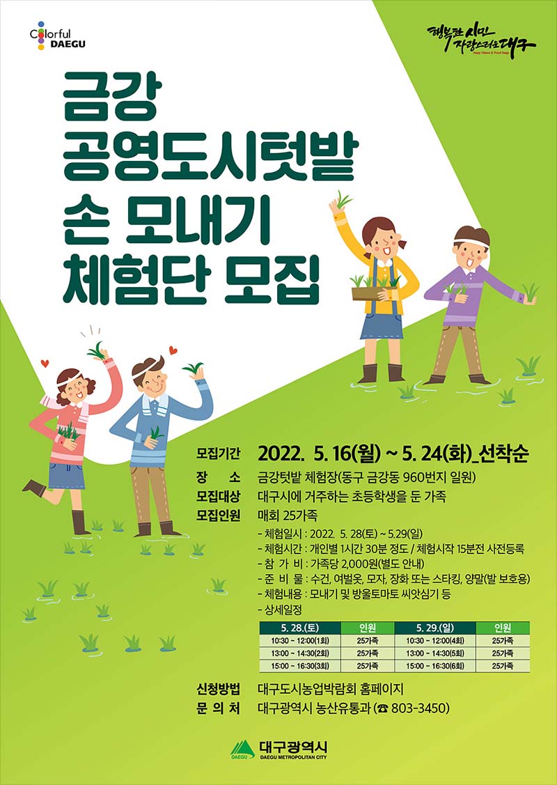 대구시가 동구 금강동 일대 공영 도시 텃밭에서 모내기 체험할 가족을 모집합니다.