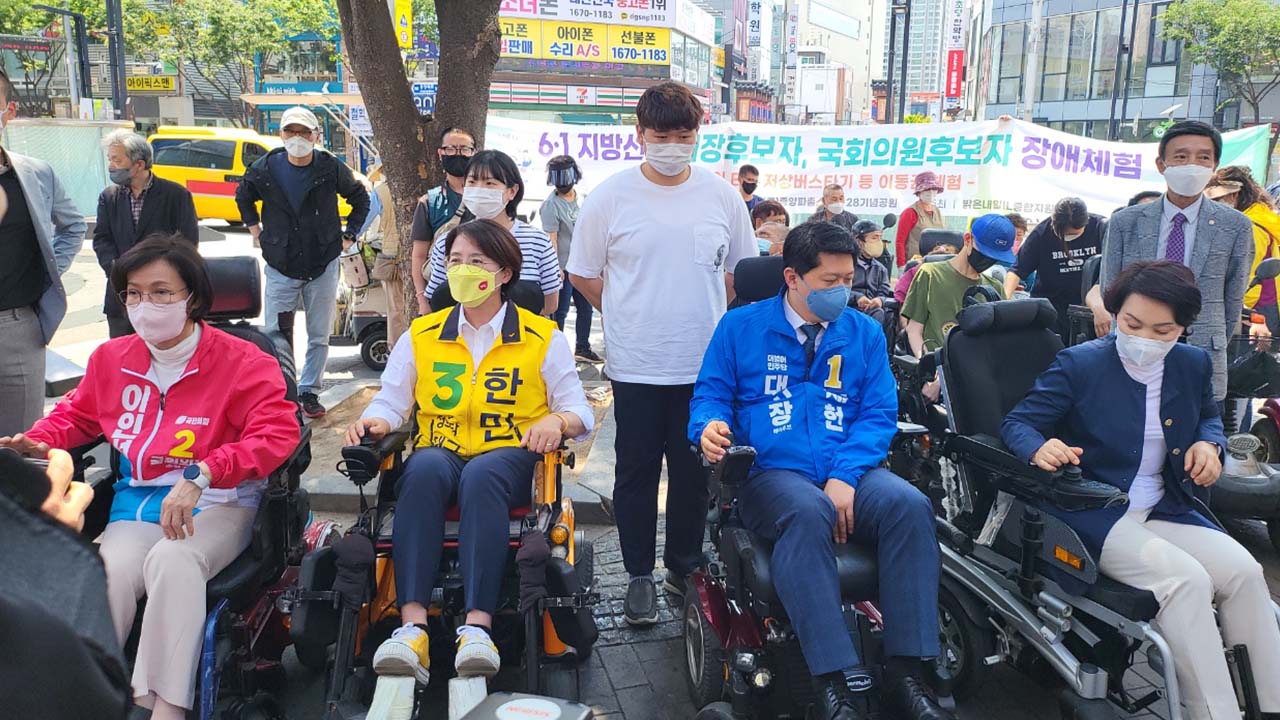 대구지역 지방선거에 출마한 후보자 등이 휠체어를 타고 버스를 타는 등 장애인 이동권 체험 행사를 했습니다.