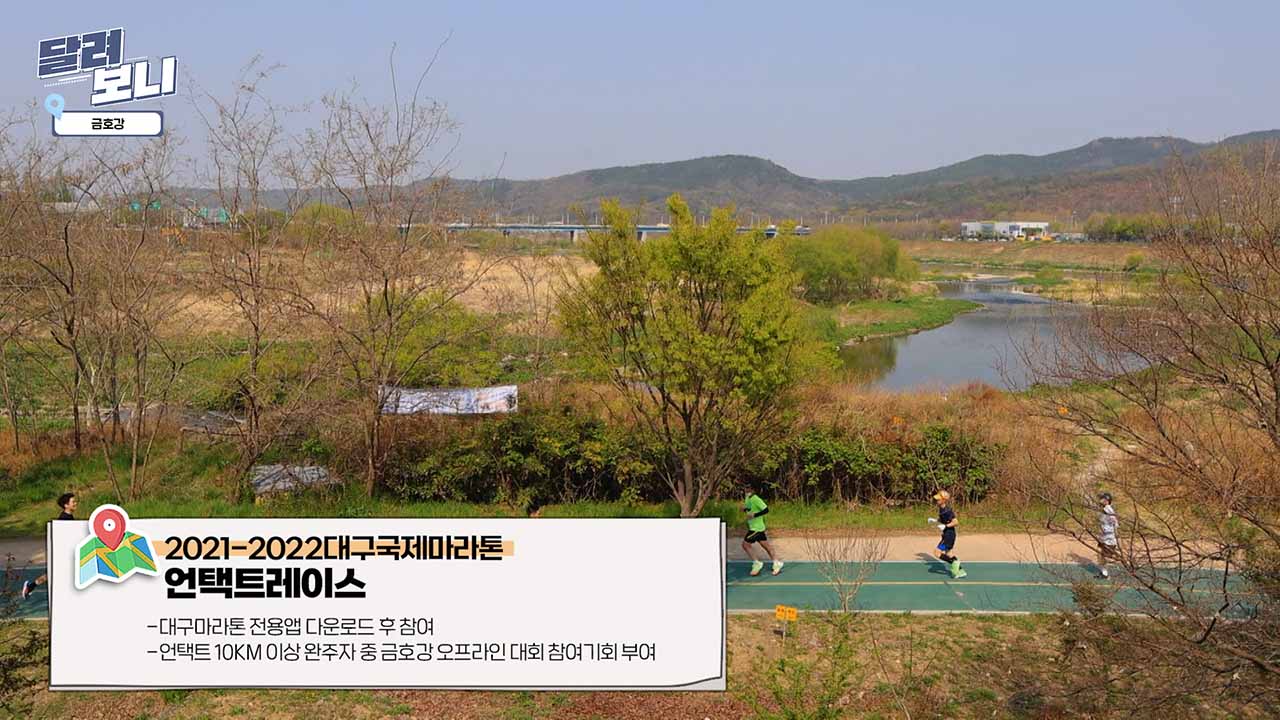 코로나19 사태 이후, 2021년 비대면 방식의 마라톤을 통해 다시 뛰는 육상도시의 면모를 보여준 대구. 언택트로 펼쳐진 일반 참가자들의 대회는 2021년에 이어 2022년에도 펼쳐졌습니다. 각각 저마다의 자리에서 '대구마라톤 전용 앱'으로 10km 이상을 달리는 것이 대회의 참가 요건이었죠. 그리고 비대면 대회의 아쉬움을 극복하기 위해 일부 참가자들에 대해 오프라인 대회 참여 기회를 부여했습니다. 2021년과 2022년, 일반 마스터즈 참가자들이 모여 달렸던 코스가 바로 동천 유원지를 출발점으로 둔 금호강 코스였는데요. 지난번 대구스타디움 코스에 이어 두 번째로 소개할 코스가 바로 '금호강'입니다.