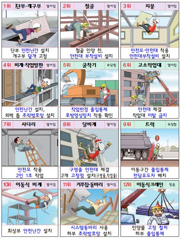 고용노동부는 열린 곳에 덮개를 설치하는 등 건설 현장 12대 사망사고의 요인을 발표하고 안전조치와 장비가 제대로 갖춰지고 시행되고 있는지 중점 점검해줄 것을 강조했습니다.