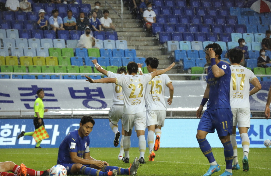 치열하게 경기가 이어지던 전반 중반 상대 수원의 정호진이 퇴장을 당하며 수적 우위를 점한 대구는 전반 29분 조진우의 선취골까지 터지며 1대 0으로 전반을 마무리했습니다.