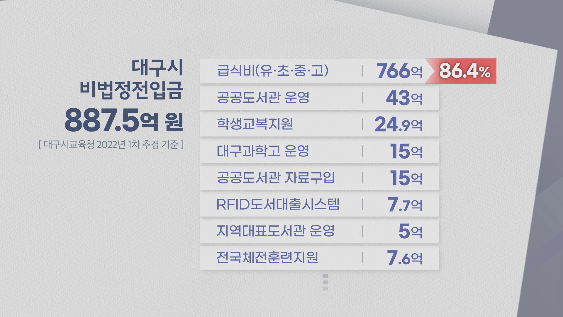 현재 급식비 부담 비율은, 초등학교는 교육청과 대구시가 5대 5, 중·고등학교는 교육청과 대구시, 8개 구·군이 5대 4대 1로 부담하고 있습니다.