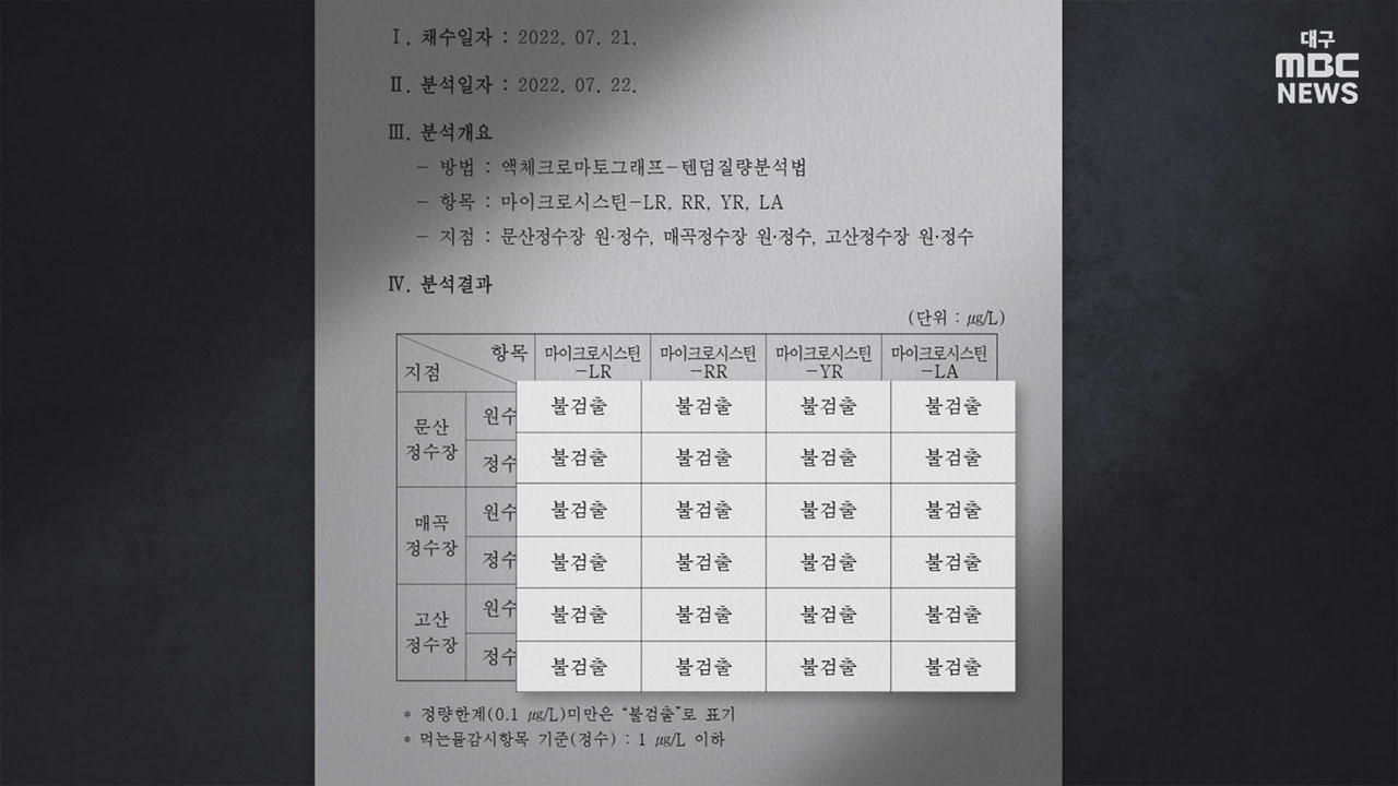 그런데 대구시 수질연구소도 같은 날 같은 조건에서 측정 검사를 했지만 마이크로시스틴은 나오지 않았습니다. 부경대의 분석 결과와 달리 정수와 원수 모두 마이크로시스틴이 검출되지 않았습니다.