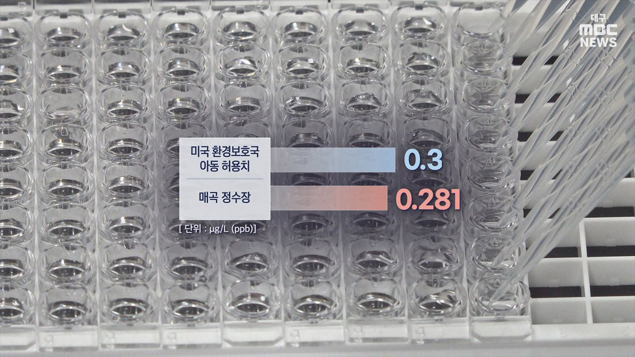 미국 오하이오 환경보호국의 성인 허용 기준치인 1.6 마이크로그램 이하이지만 아동 허용치를 보면 상황은 달라집니다. 특히, 매곡정수장은 아동 허용치인 0.3 마이크로그램에 근접한 수치입니다.