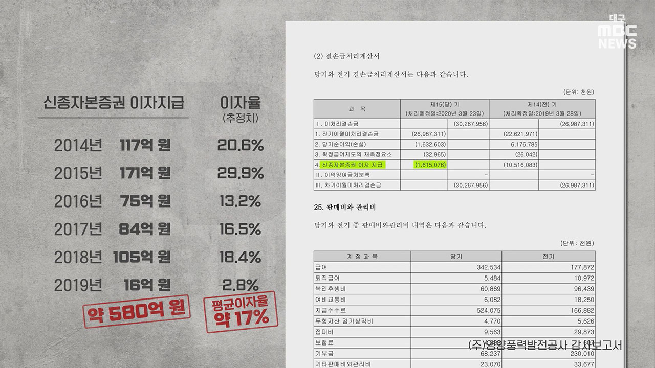 하승수 세금도둑잡아라 공동대표 "여기 회사들의 감사보고서를 살펴보면요, 영양 풍력발전의 경우 맥쿼리가 신종자본증권이라는 걸 발행시켰더라고요. 매년 이자로 117억, 171억, 94억 이렇게 계속 나가고 있어요. 이건 은행이나 기업이 주로 자본을 늘리기 위해서 발행하는 건데 매년 이자가 100억 정도 나왔다는 건 15%에서 30%에 달하는 고리 이자인 거예요.