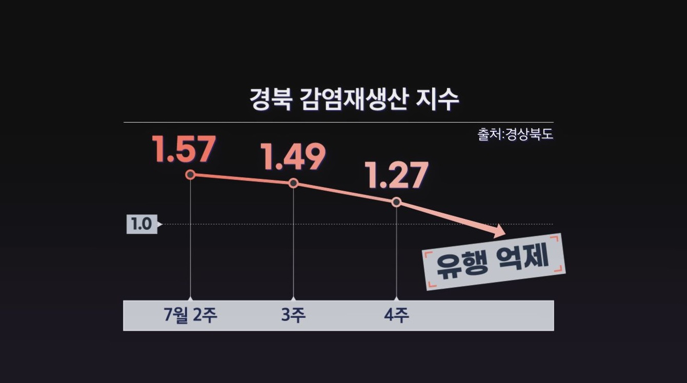 경북지역 감염재생산지수는 7월 둘째 주 1.57이었던 지수가 셋째 주 1.49, 넷째 주에는 1.27까지 낮아졌습니다.