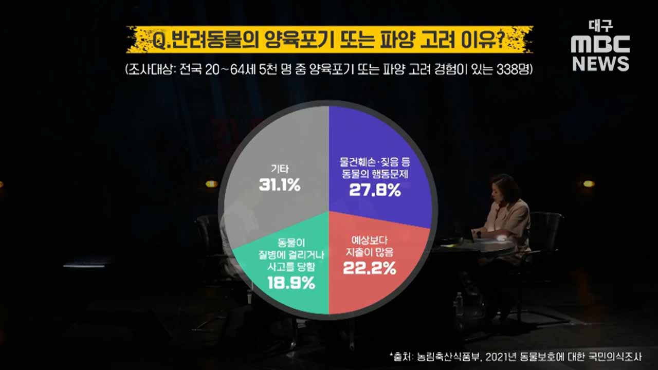 실제 농림축산식품부가 2021년에 한 국민 의식 조사를 보면, 반려동물의 양육 포기나 파양을 고려한 적이 있느냐는 물음에 26.1%가 "있다"고 응답했습니다.