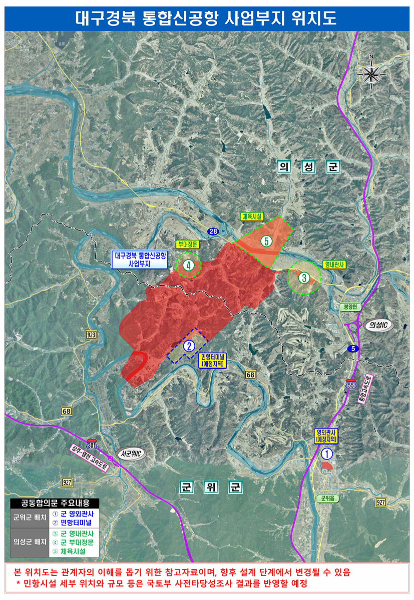 의성군 쪽으로는 군부대 정문과 영내 관사, 체육시설 등이 들어서고 군위군에는 민항터미널과 영외 관사가 들어섭니다.
