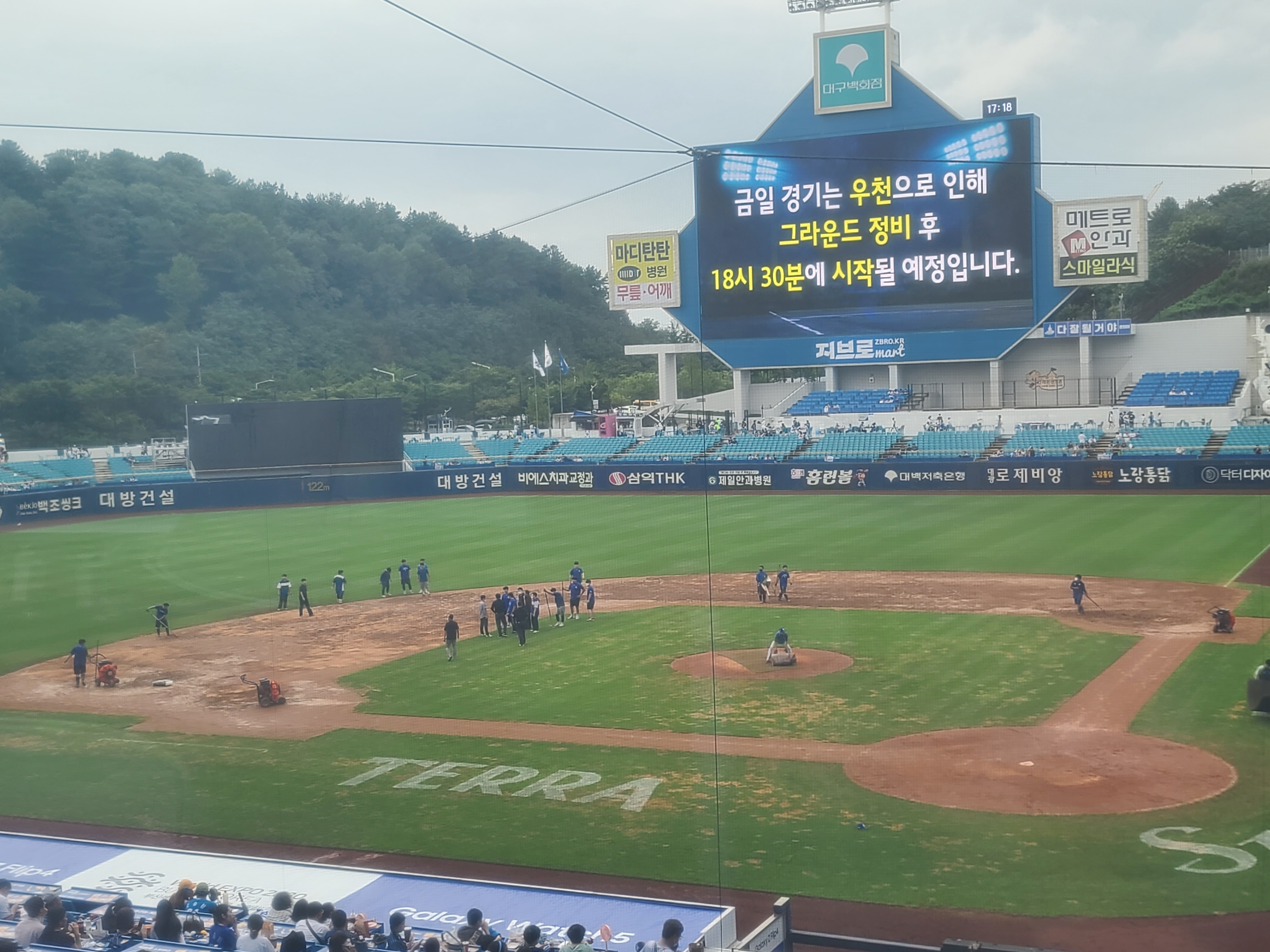 새벽부터 대구에서 많은 비가 내리자 구단 관계자들은 오전부터 방수포를 덮었지만, 그라운드가 상당히 젖어 있었고 비가 그친 오후부터 정비 작업을 빠르게 펼쳤지만, 쉽지 않은 상황이었습니다.