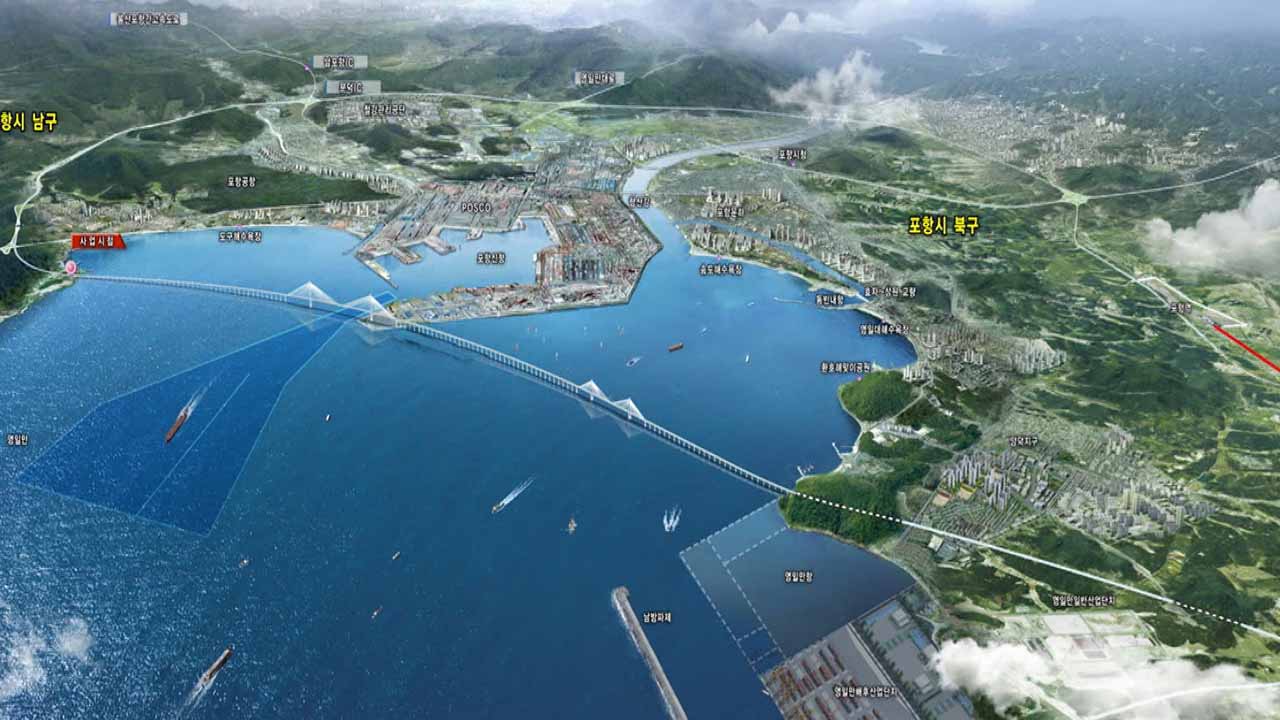영일만대교는 포항 남구 동해면에서 북구 흥해읍을 잇는 총길이 18㎞의 다리로, 윤석열 대통령이 대선 공약으로 내건 사업입니다.