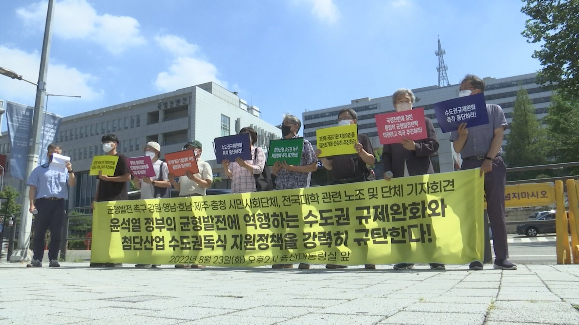 균형발전을 촉구하는 강원·영남·호남·제주 충청권 시민사회단체와 교수 노조 등이 8월 23일 용산 대통령실 앞에서 기자회견을 열고 첨단산업 수도권 독식 지원정책을 규탄하기도 했습니다.