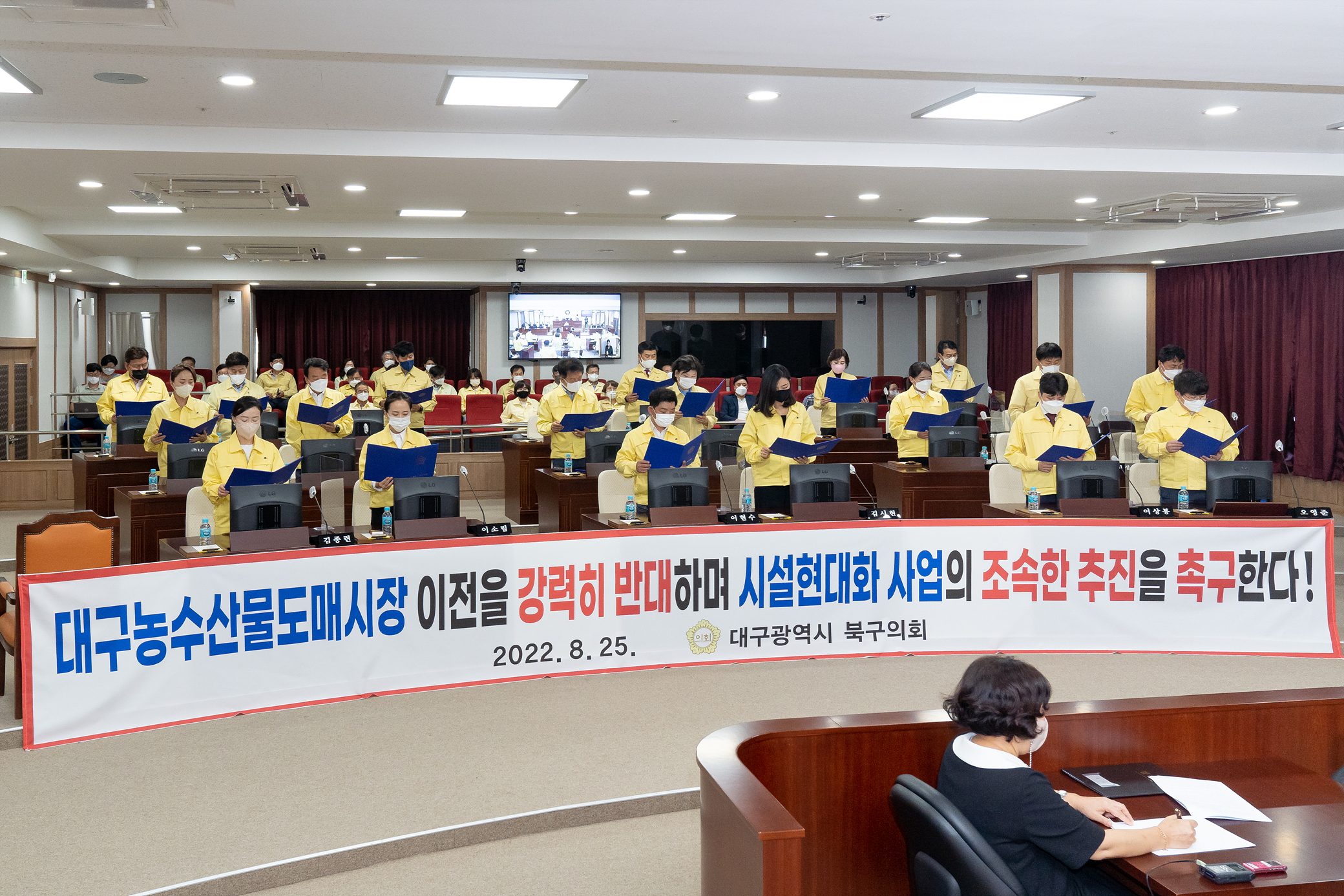 북구의회는 제272회 임시회가 열린 본회의장에서 대구농수산물도매시장 이전 반대를 촉구하는 성명서를 의원 21명 만장일치로 채택하고 발표했습니다.