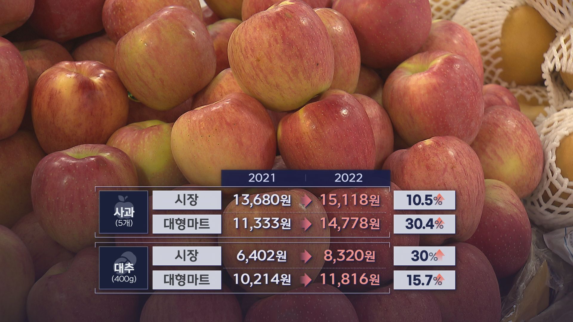 대추나 사과, 배 등도 가격은 2021년보다는 올랐지만 햇생산품과 정부 보유물량이 집중 출하되면서 8월 중순보다는 가격이 내림세를 보였습니다.