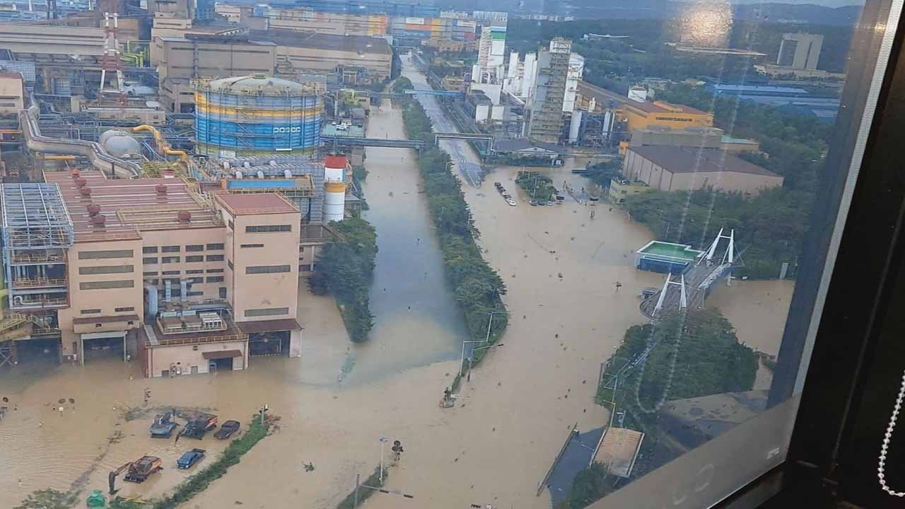 포스코는 6일 새벽 포항시 오천읍 등 제철소 상류 지역에 505mm의 기록적인 폭우와 인근 냉천의 범람으로 주요 설비동의 지하와 1층이 침수됐고, 정전까지 발생해 현재 생산과 출하 등 공장 가동을 일시 중단했다고 밝혔습니다.