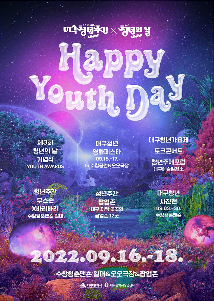 토요일인 17일 오후 3시에는 예술발전소에서 '일생활 균형'을 주제로 한 토크콘서트가 펼쳐지고, 저녁 6시 수창청춘맨숀 앞 무대에서 청년의 날 기념식이 열립니다.