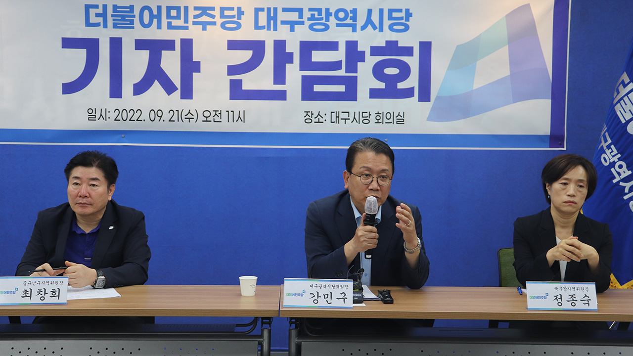 민주당 강민구 대구시당위원장이 기자 간담회를 열고 취임 석 달을 앞둔 홍준표 대구시장에 대해 "불통과 오만, 독선의 리더십"이라고 비판했습니다.