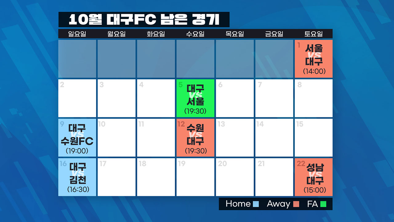 대구FC는 10월 1일부터 K리그 파이널 5경기와 FA 컵 준결승을 치릅니다.