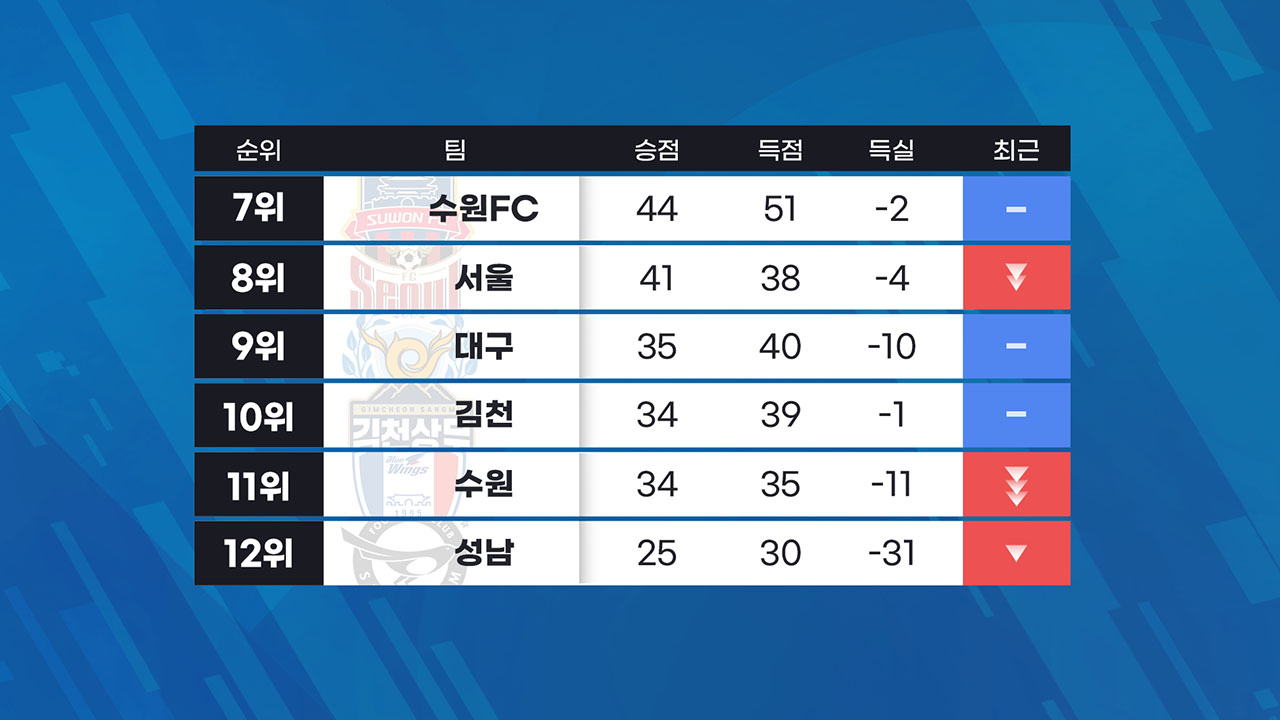 최하위 12위 성남과는 승점 차가 좀 있습니다만, 10, 11위 그룹과는 승점 1, 2점 차에 불과한데요.