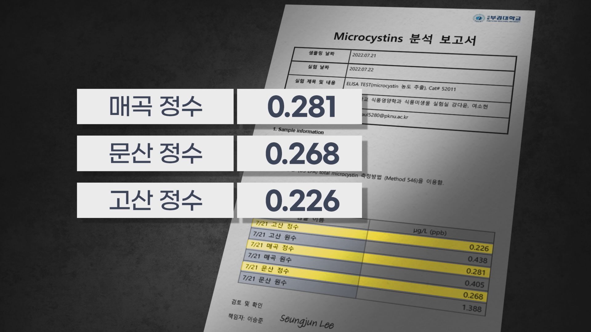그 결과 독성물질인 마이크로시스틴이 매곡과 문산, 고산정수장의 정수한 물에서 각각 0.226~0.281ppb가 검출됐는데요.