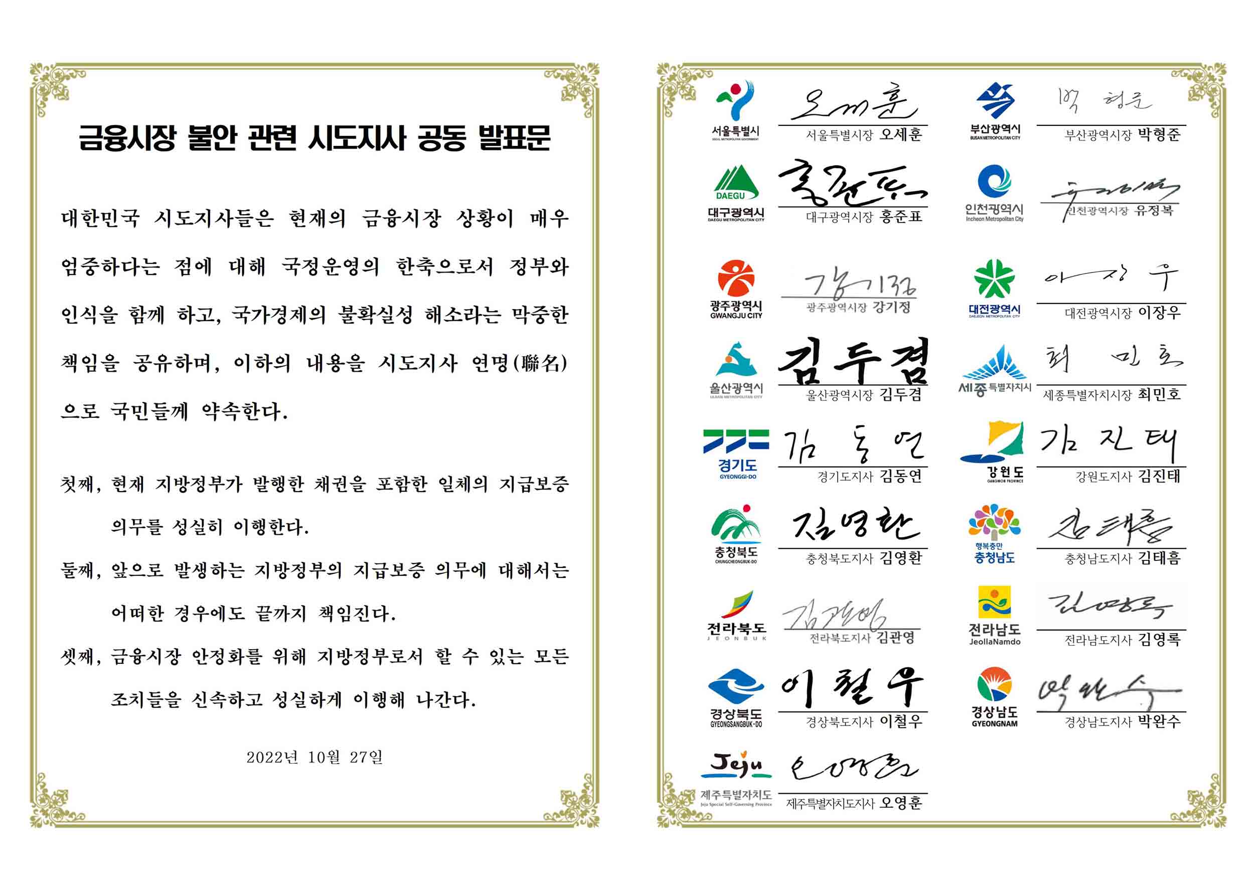 전국 17개 시도 단체장들이 금융시장 불안을 해소하기 위해 "지방정부가 발행한 채권을 포함한 일체의 지급 보증 의무를 성실히 이행하겠다"는 내용의 공동 발표문을 내놨습니다.
