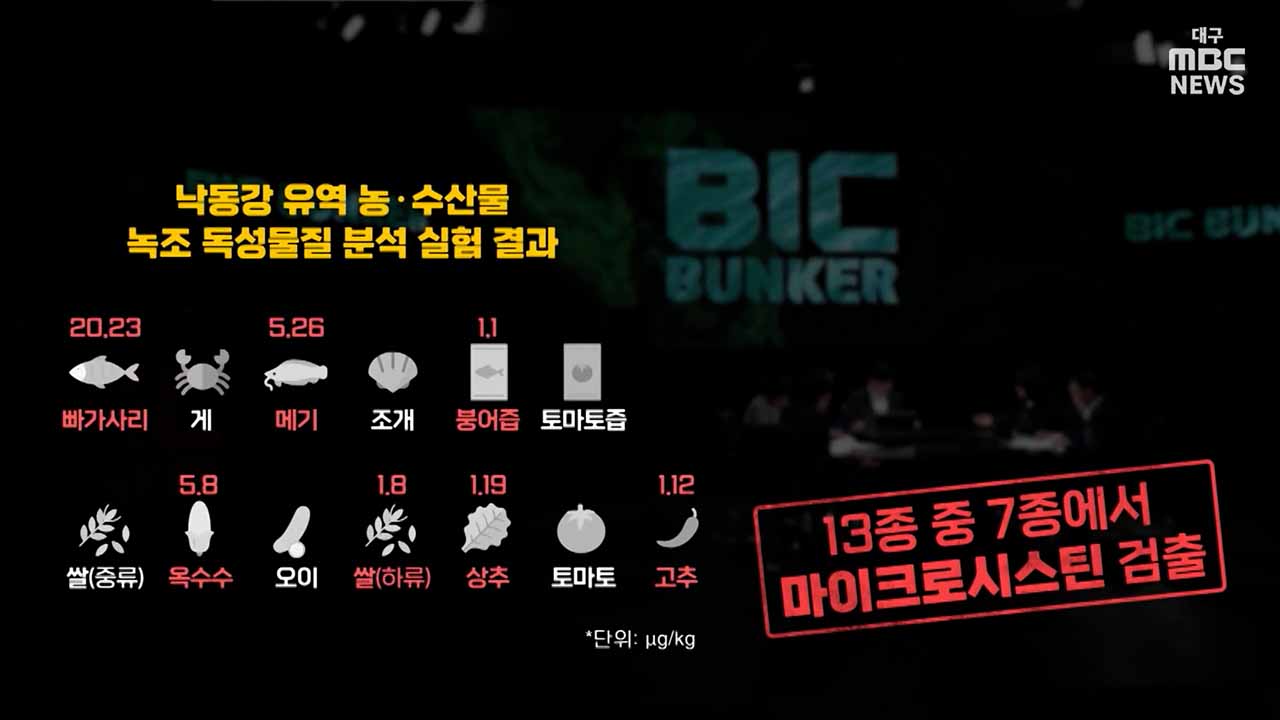 강찬수 중앙일보 기자 "수산물의 경우는 더 심각합니다. 흔히 민물매운탕으로 먹는 빠가사리(동자개)나 메기에서 높은 수치의 마이크로시스틴이 검출습니다. 실제 미국 환경청의 경우 녹조가 있는 강에서 잡은 생선의 경우 내장을 제거하여 먹으라고 권고하고 있는데요. 미국에서 잡은 생선은 마이크로시스틴 수치가 우리보다 월등히 낮기 때문에 그렇게 할 수 있는 거고, 이번에 이런 결과가 난 빠가사리(동자개)는 미국 기준으로 보면 마이크로시스틴 수치가 너무 높아서 절대 먹어서는 안 되는 거죠"