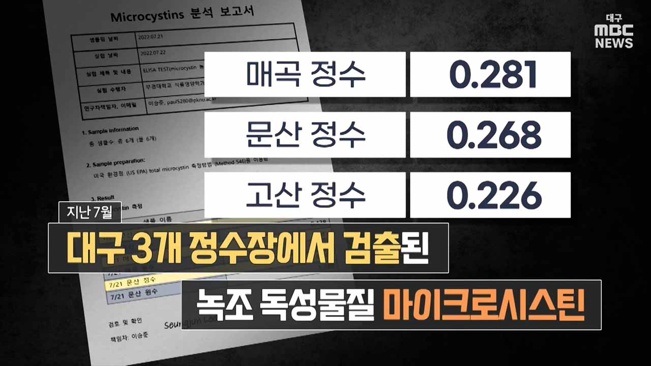 대구MBC와 대구환경운동연합은 대구의 주요 정수장 3곳으로 들어오는 원수와 정수를 마치고 가정으로 공급되기 직전의 물을 채취해 부경대학교 연구팀에 분석을 의뢰했습니다. 그 결과 정수한 모든 물, 즉 수돗물에서 마이크로시스틴이 검출됐습니다. 원수가 아닌 수돗물에서 마이크로시스틴이 검출된 건 이번이 처음입니다.