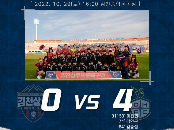 1차전에서 한 점차 패배로 승리가 절실했던 김천상무는 10월 29일 오후 김천종합운동장에서 펼쳐진 대전하나시티즌과의 시즌 마지막 홈 경기 승강PO 2차전에서 0대 4로 지면서 2부리그 강등이 확정됐습니다.