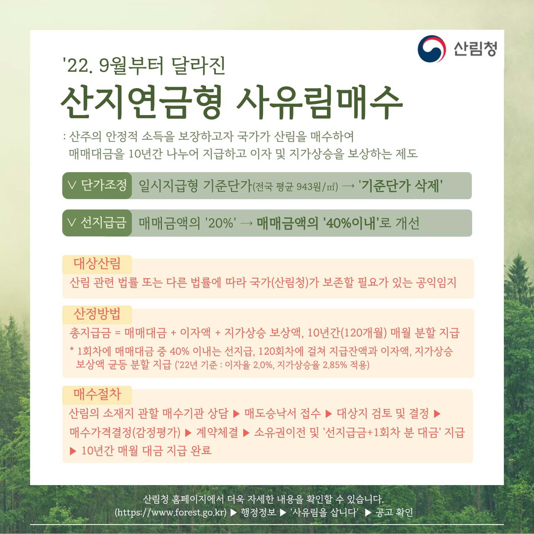 산림청은 각종 규제에 묶여있는 사유림 매입을 확대하기 위해 매입 대금을 10년 동안 연금식으로 지급하고 있습니다.