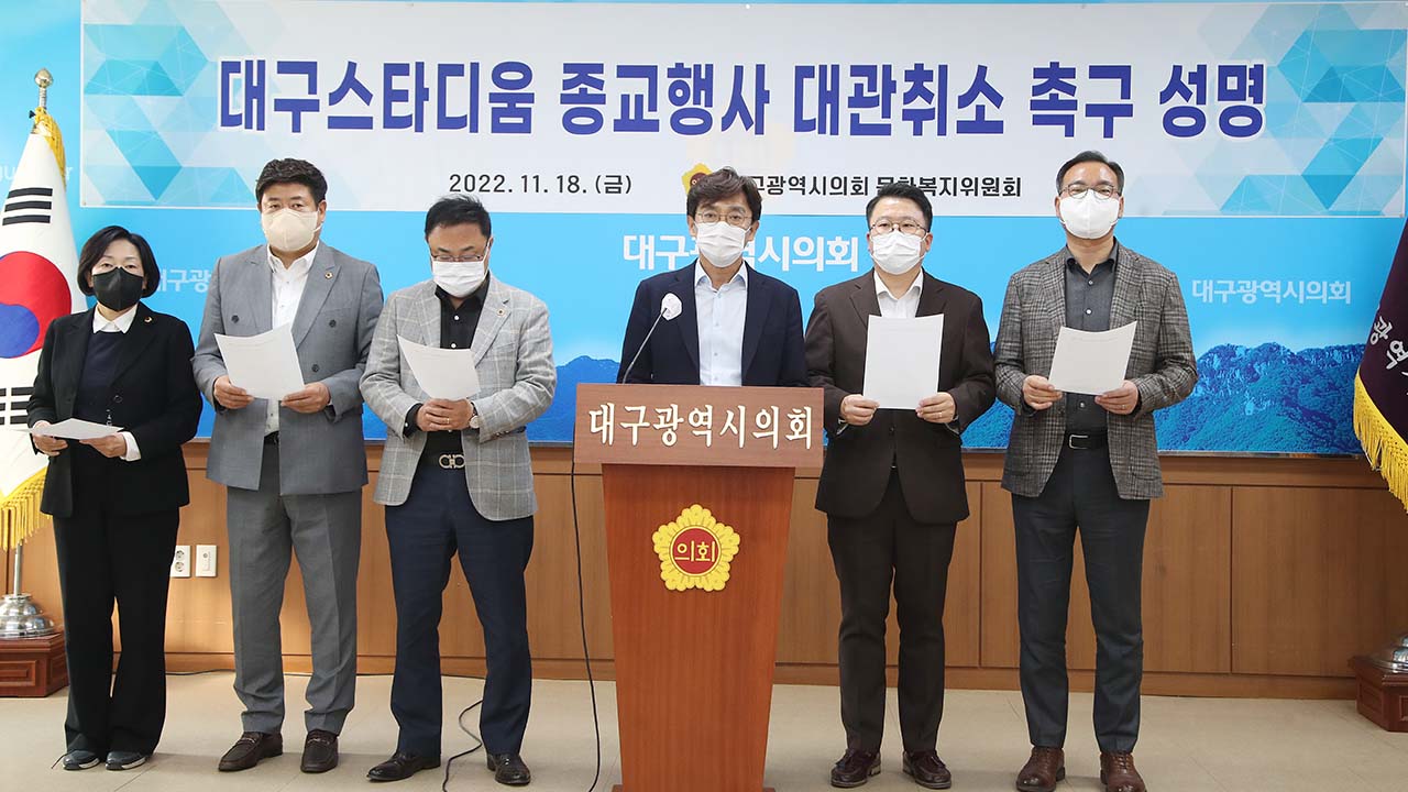 대구시의회 문화복지위원회는 오는 11월 20일 대구스타디움에 10만 명이 운집하기로 예정된 특정 종교행사의 대관을 취소하라고 촉구하는 성명을 18일 발표했습니다.