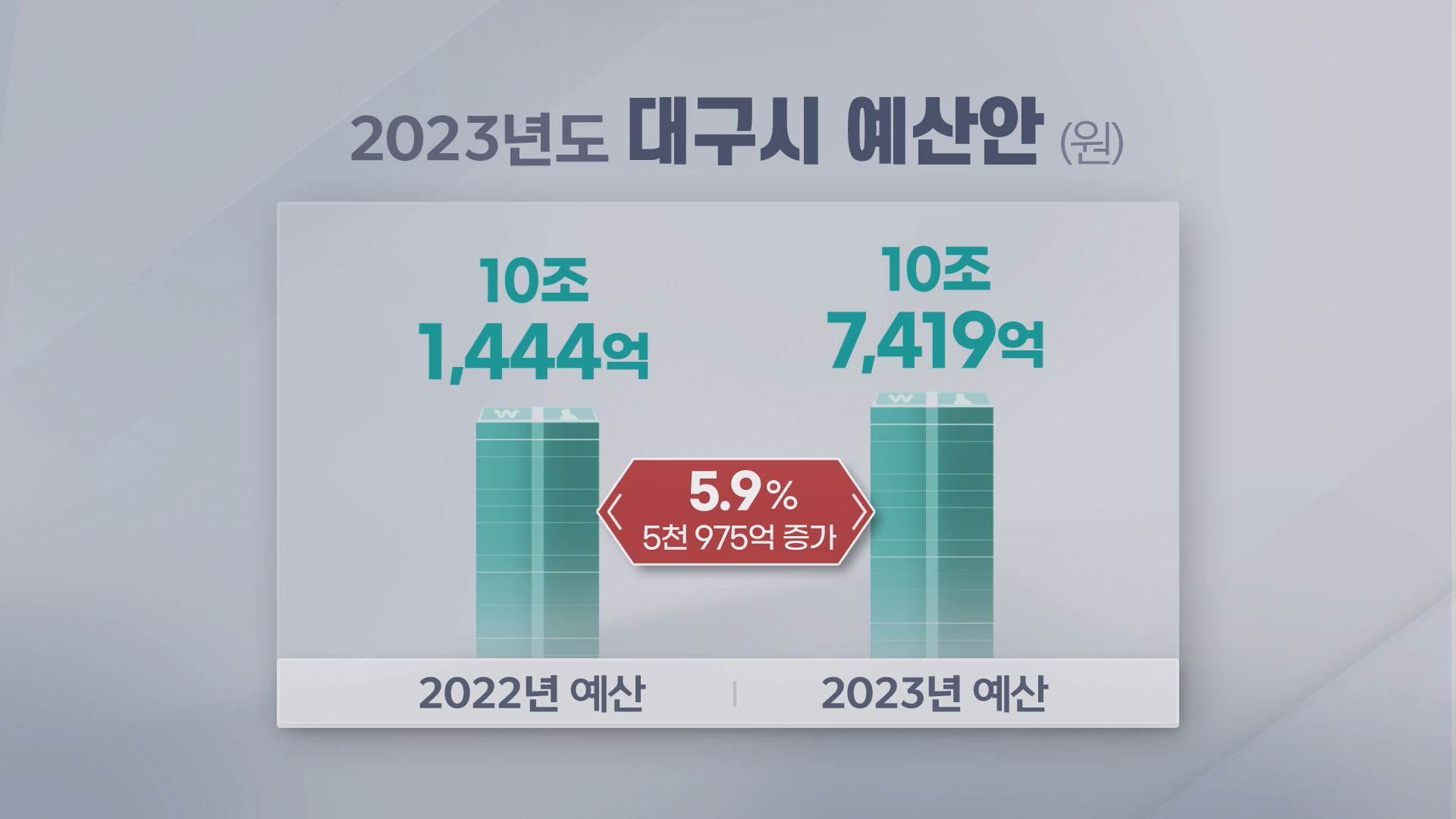 2023년 대구시의 예산은 10조 7,419억 원으로 2022년 예산보다 5,900억 원이 늘었습니다.