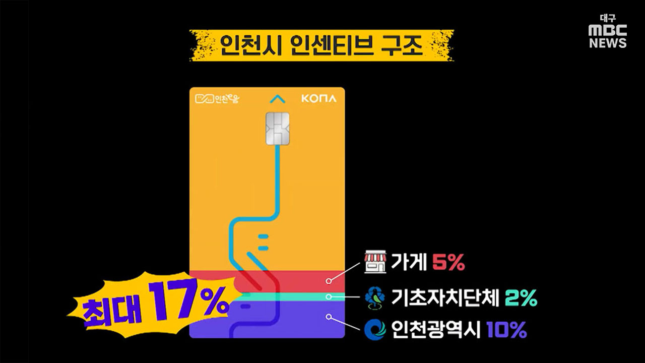 그러니까 인천시는 여러 구조를 만든 건데요, 어느 가게, 어느 동네에서 썼느냐에 따라서 캐시백이 다른데, 최소 5%에서 최대 17%의 캐시백 혜택을 얻게 됩니다.