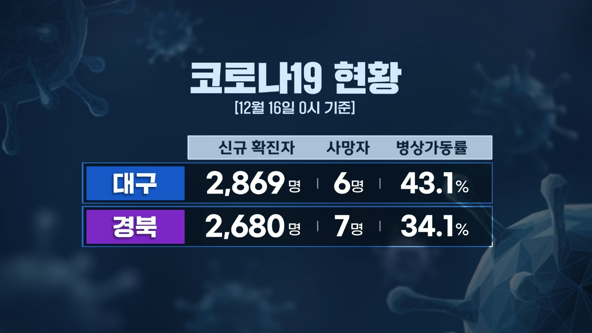 12월 16일 0시 기준 대구의 코로나 신규 확진자는 2,869명이고, 경북의 확진자는 2,680명입니다.