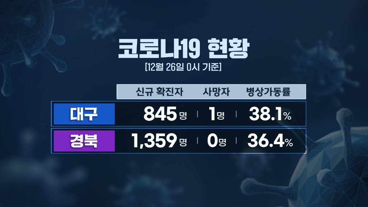 12월 26일 0시 기준 코로나 19 신규 확진자는 대구 845명, 경북 1,359명으로, 지난주 같은 요일에 비해 대구는 128명, 경북은 11명 줄었습니다.