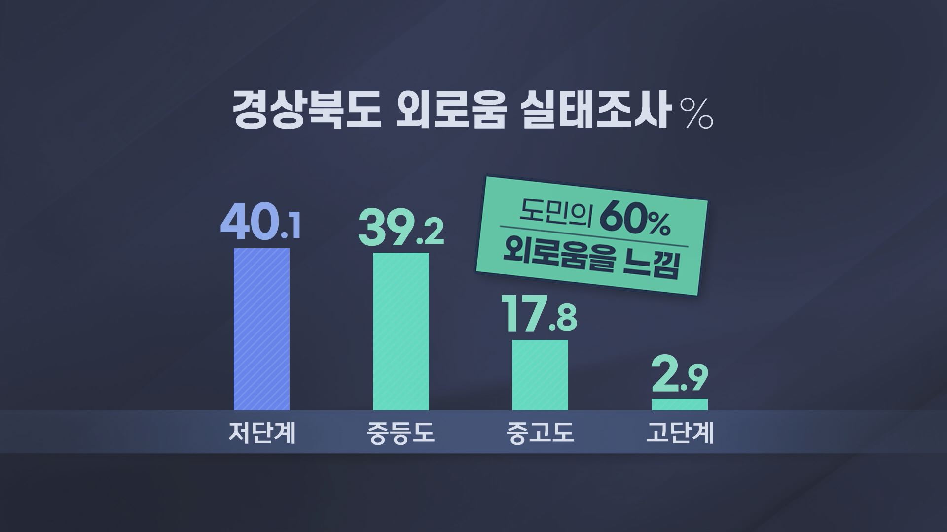 경상북도가 2022년 도민들을 상대로 외로움에 대한 실태 조사를 한 적 있는데요, 이때 도민 10명 가운데 6명이 외로움을 느끼는 것으로 나타났고 외로움 지수라는 것을 개발해 비교해 봤더니 우울 위험군의 증가와 밀접한 관계가 있는 것으로 나타났습니다.